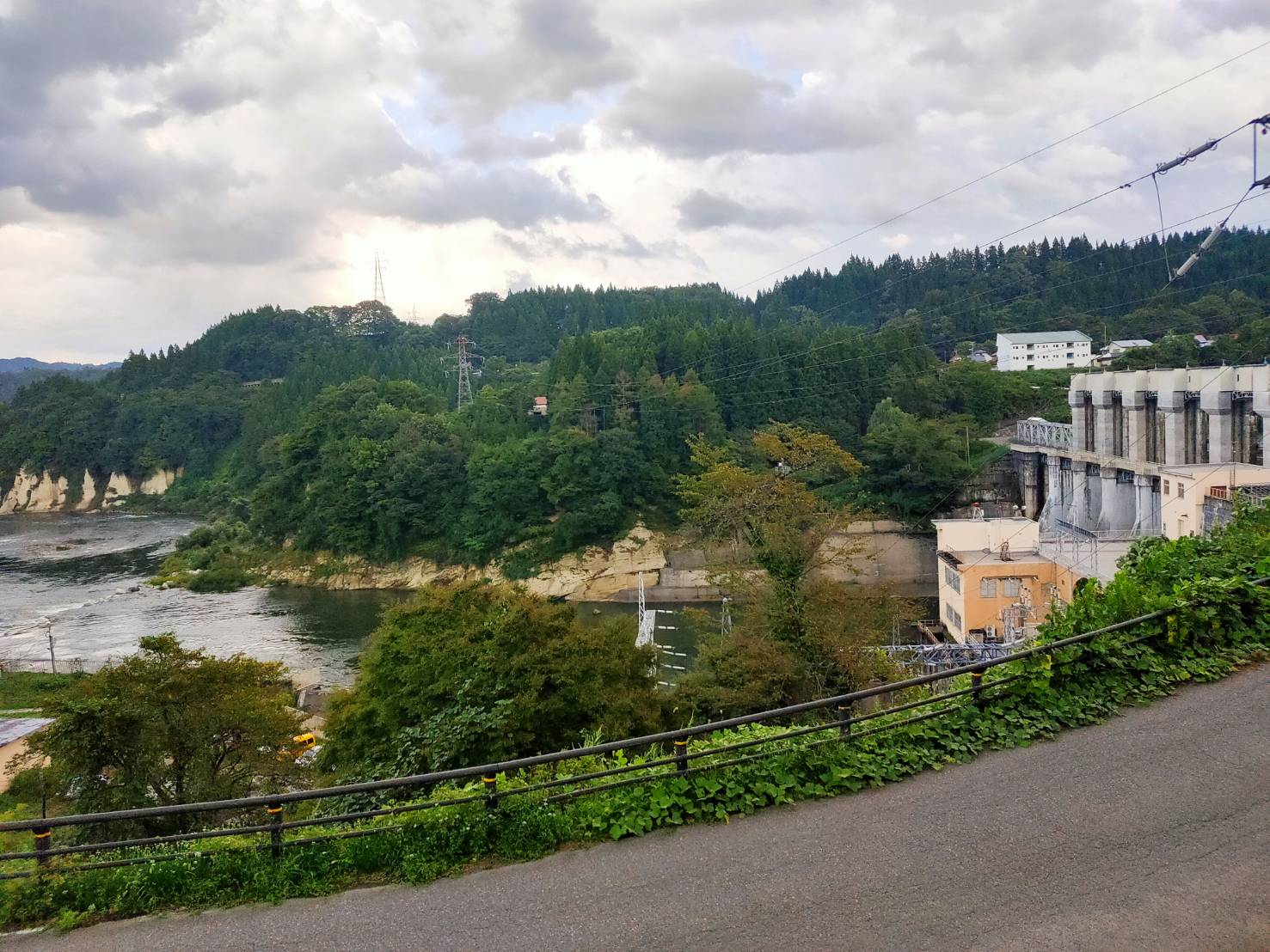 円蔵寺の下の駐車場からの只見川と遊覧船