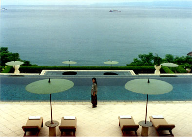 丘、海、島、とプール、建物が見事な調和を醸し出している。 海の向こうをロンボク島行きの船が行き交う。