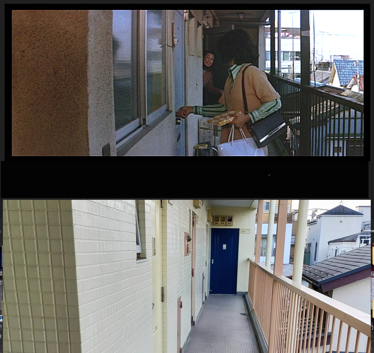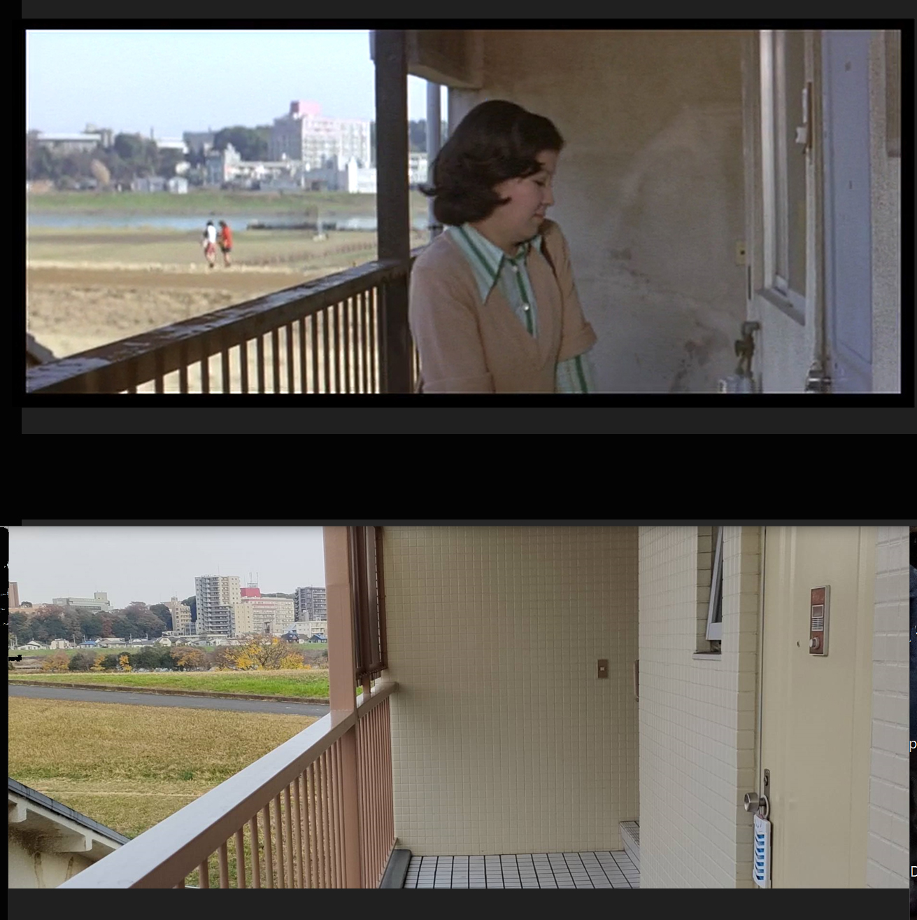 | お気楽コラム 【 寅次郎な日々 】 バックナンバー ご近所だった!さくらの家と京子さんのアパート 2010年6月2日 寅次郎な日々 その441 この文書には本編のネタバレが含まれます。お気をつけ下さい。 号外!2021年2月2日 新事実判明! 第14作「寅次郎子守唄」 木谷京子さんのアパートは 長年思っていた場所のさらに2軒隣だった! http://www.yoshikawatakaaki.com/lang-jap/kitani1.html ![]() 2010年の調査で、てっきり二軒隣のアパートだと思っていたら、 2020年、長年の友人のTさんの実地調査によってこのアパートの可能性が強くなったのだ。 撮影当事からすでに40数年経ってアパートの階段部分が壁で囲われていたゆえに 私は2010年当時は気づかなかった。いかにも10年前にめぼしをつけたアパートの方が 京子さんのアパートの名残を見せていたのでついついそっちだと思っていたのだ。 ![]() ![]() ![]() まず、京子さんは京成 江戸川駅で下りて江戸川の方へ歩いていく。↓ ![]() 下の航空写真で分かるように江戸川駅から江戸川土手はすぐそばだ。 ![]() で、京子さんは江戸川土手沿いのアパートに到着 ![]() 母親の木谷はなさんから届いた小包に住所が書いてあるが、 こういうのは例のごとく、当然スタッフはわからないように本当の場所とはずらしてある。 江戸川区北小岩四の十三の六 木谷京子 様 と一応なって入るが… 「ちびとら」さんは、それでも住所に書かれてあった場所を歩いて調べてみられた。 案の定江戸川土手の方向ではなかったそうで、やはりこの住所はダミーだったそうだ。 ![]() 。 その時位置確認の唯一の決め手となったのが ↓のアパートの向こうに見える江戸川河川敷と川そして赤い突起物があるビルだ。 「ちびとらさん」は、このビルが1972年かに施工した「市川国府台マンション」であることを確かめられ、 間違いなくこの作品に映っているのはそのマンションだと確信された。 ![]() あとはビルの見え方を考えてピンポイントで絞られたのだ。 先日のTさんの時にも書いたが、彼らロケ探しの達人たちは自分の足で目的地を探される。 実際に江戸川駅から歩かれて現地でキャプチャー画像と見比べながら調査され、 じっくり楽しみながら自分の足で地面を踏みしめて汗をかいて風を受けて絞っていかれるのがなんともカッコいいわけだ。 結論としては、京子さんはあのアパートの二階の角部屋あたりに住んでいたと思われる。 一応、伝家の宝刀20世紀1997年の航空写真で見てみたがすでにこの新しいアパートは 1997年時点で建っていた。 京子さんのアパートは『江戸川区北小岩4丁目37付近』 京成江戸川駅から徒歩で5分もかからない鉄橋の近くの場所だった。 ちなみについでに川向こうの赤い屋根の市川国府台マンションにもストリートビューで行ってみた。 結構大きなマンションで、横が国府台神社だった。 ![]() 号外!2021年2月2日 新事実判明! 第14作「寅次郎子守唄」 木谷京子さんのアパートは 長年思っていた場所のさらに2軒隣だった! http://www.yoshikawatakaaki.com/lang-jap/kitani1.html ![]() あの風景、なんと『さくらの家』の前からすぐ江戸川土手に上がった風景だったのだ!! つまりあの京子さんのアパートの位置は 『さくらの家』から土手沿いに 徒歩でほんの5〜6分ほどだった! さくらたちの家と言っても、もちろん寅の言うところの昔の潜水艦アパートではない。 一軒家のほうである。 最初はあの一軒家は現在の北総線新柴又駅東側土手沿い高架近く(柴又5丁目)にあり、 映画ではあの家を買って以来全然引越していないことになっているが、 ロケの諸事情により3回一軒家を変えている。(合計4軒) これは以前も書いたが、 最初の一軒家は26作「寅次郎かもめ歌」〜40作「寅次郎サラダ記念日」まで。 しかし、総武線の高架計画のためついに立ち退きになる(TT) ちなみにこの一番目のさくらの家と 英語塾を開いていためぐみさん圭子さん母娘の家は結構近いのだ! ![]() 次に第41作「寅次郎心の旅路」〜42作「ぼくの伯父さん」まで。ちょっと金町寄り。 しかし家の横で工事が始まってしまう。 ちなみに、この2番目の家はなんと散歩先生宅と同じ東金町!。 だから散歩先生はさくらの2番目の家のご近所。 ![]() また変わって第43作「寅次郎の休日」〜第45作「寅次郎の青春」まで。 しかし、これまた近くの家の環境が変わったので家替え。 このあたりにあの早苗さんも住んでいた! つまりさくらの3番目の家と早苗さんのアパートは同じ北小岩! さくらの家はこのように次々にみなさんとご近所になっていく。(((^^;) ![]() そして第46作「寅次郎の縁談」から〜第48作「寅次郎紅の花」まで。 家の大きさは徐々に大きくなっていった気もする((((^^;) さくらの↑の3番目の家ともさほど離れてはいない同じ北小岩! 走る博の右に見えるグレーの屋根の白い家 ![]() で、今回の発見は、そのうちの、シリーズ最後の家とその前の風景。 京子さんのアパートから見えたあの川原や川向こうの風景は 第46作から第48作まで使われた、あの家の前の風景だったのだ